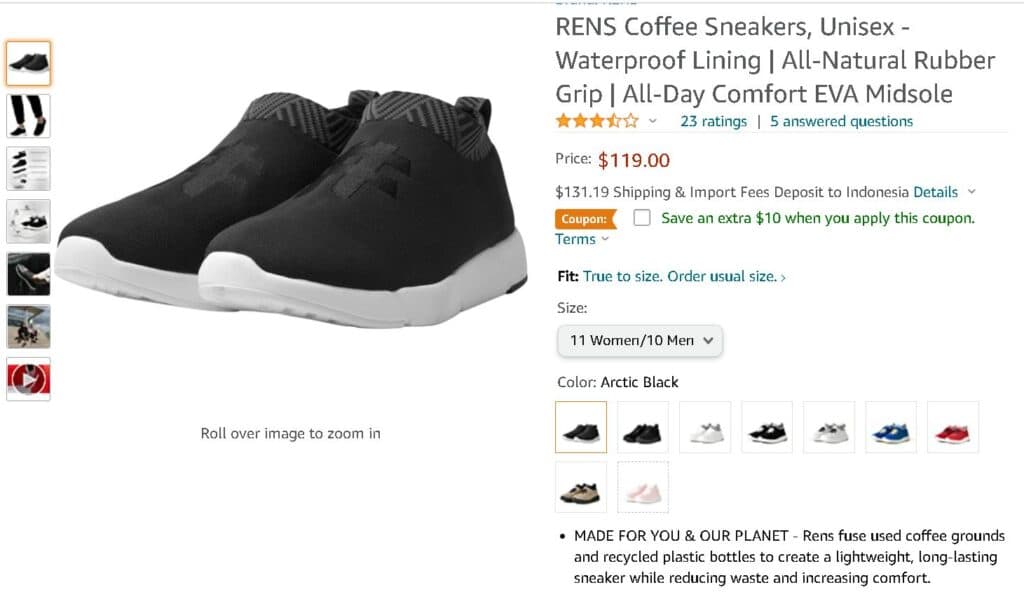 Produksi sepatu pabrikan Rens ini menghabiskan 21 cangkir kopi dan 6 botol plastik daur ulang untuk lapisan luar setiap pasang sepatu. Sepatu Rens ini hadir dalam 9 warna berbeda, tahan air serta sangat nyaman digunakan. Selain itu, sepatu ini dapat menyerap bau dan dirancang agar mudah dilepas dan dipakai.